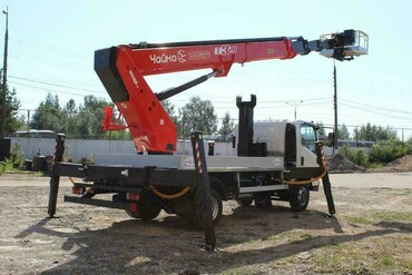Подъёмник представляет собой телескопическую стрелу с люлькой, установленной над кабиной над кабиной автомобиля.